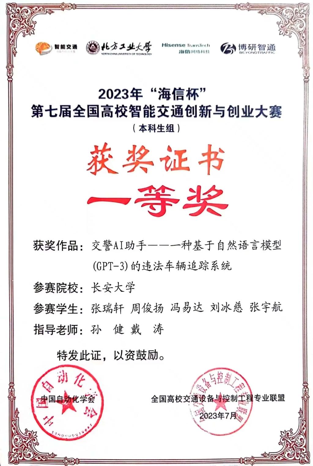 近日,2023年“海信杯”第七届全国高校智能交通创新与创业大赛决赛在北方工业大学举办。在孙健和戴涛两位老师的指导下,成人网 2021级本科生“未来交警AI队”(组长:张瑞轩,成员:周俊扬、冯易达、刘冰慈、张宇航)作品《交警AI助手——一种基于自然语言模型(GPT-3)的违法车辆追踪系统》,在全国总决赛中荣获一等奖。