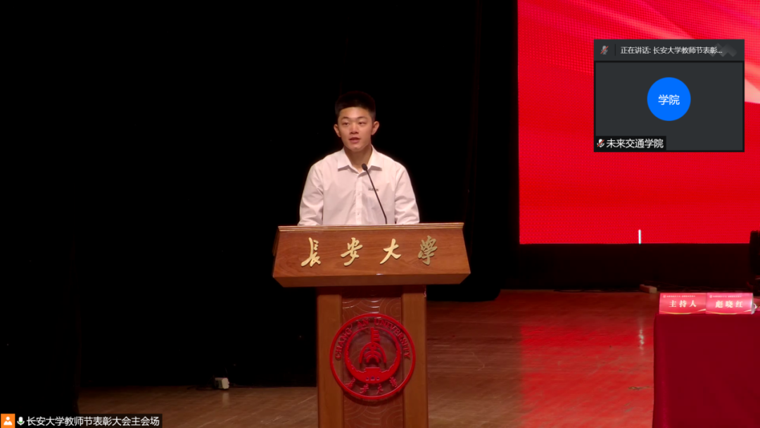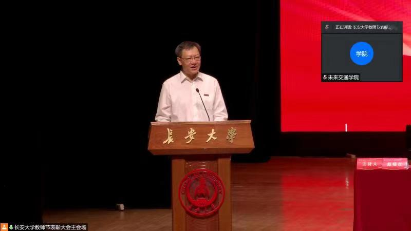 会议举行了2022年度退休教师荣休仪式和新教工入职仪式。优秀研究生指导教师、理学院教授封建湖代表获奖教师发言,他结合自身执教生涯,分享了努力成为一名“四有”好老师的人生追求。学生代表、未来交通学院2020级本科生董帅均代表长大学子向全校教师表达了感谢和节日祝愿。