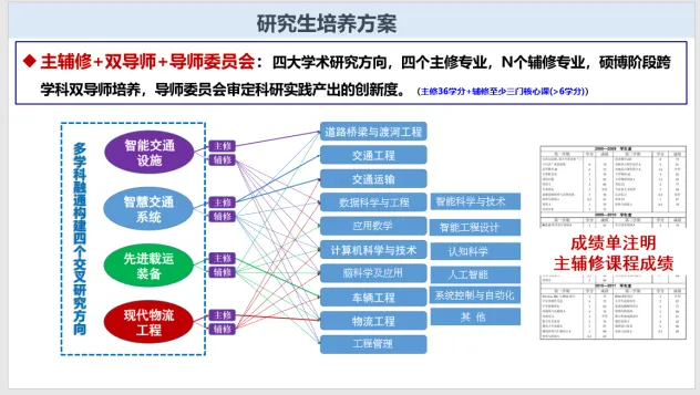 副院长崔华对未来交通学院研究生培养方案进行了解读。未来交通学院研究生培养方案立足培养未来交通科技领军人才的目标定位,紧扣未来交通领域可能面临的难题与“卡脖子”技术,在强化课程思政及其价值引领效能基础上,构建厚基础、宽口径、深融合、强创新、重产出的研究生课程体系,着重培养研究生的家国情怀、前瞻意识、科技创新能力和可持续发展能力,培养中国特色的国际化交通科技拔尖创新人才。