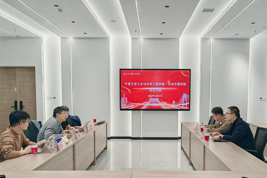 10月17日上午,宁夏大学土木与水利工程学院道桥系主任马熙伦、副主任景明海到未来交通学院进行调研交流,旨在调研借鉴未来交通学院建设发展和学科专业规划的经验。未来交通学院副院长杨旭、教师代表褚龙佳、葛海涛,综合事务部主任赵育参加座谈会。