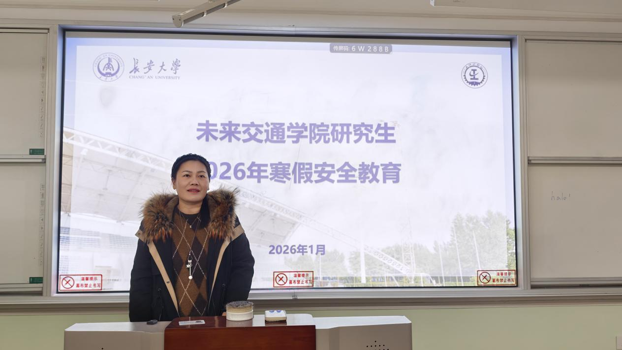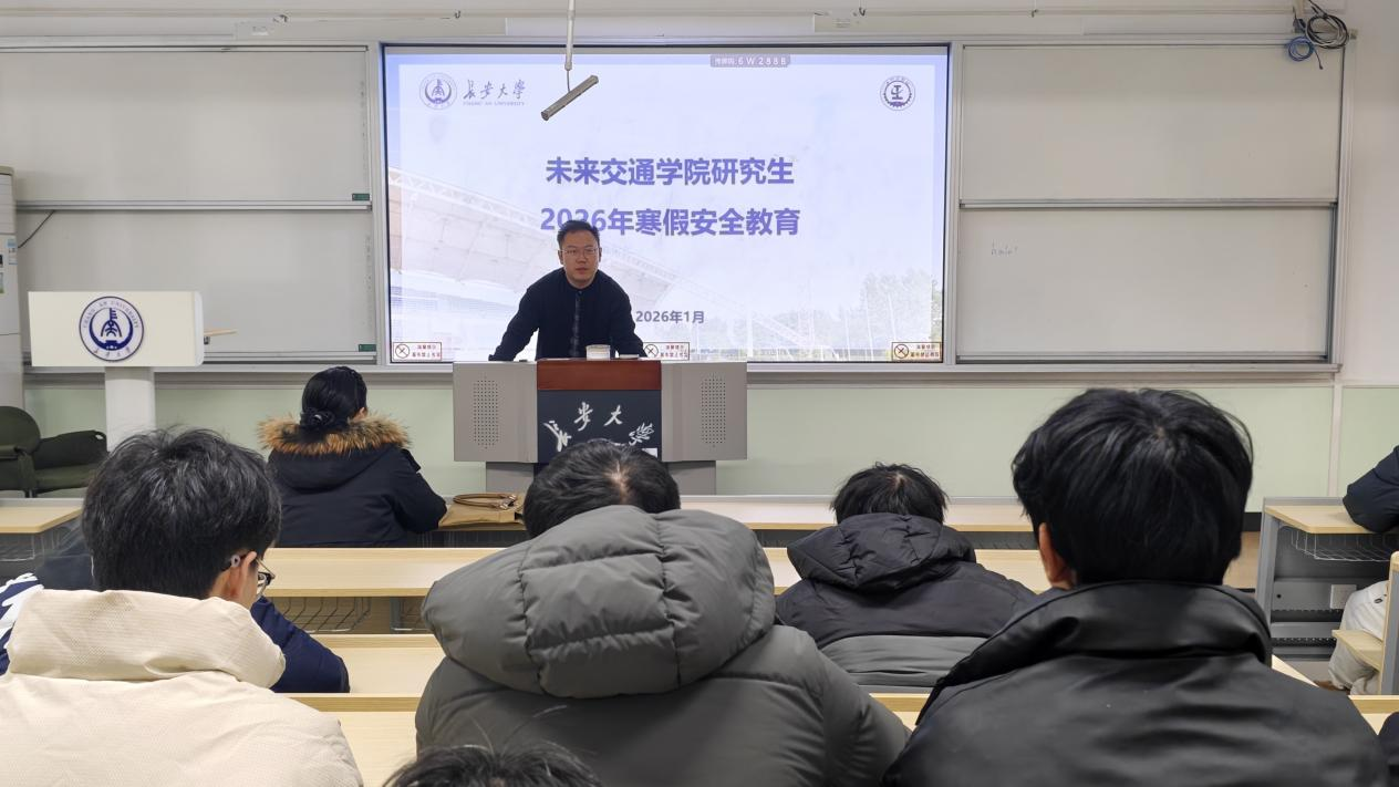 为进一步增强研究生安全防范意识,切实保障寒假期间学生人身与财产安全,1月19日下午,未来交通学院在南校区北院B102教室开展研究生2026年寒假安全教育。学院副院长汤颖颖,院学生事务部主任、研究生辅导员刘志兴出席会议,全体研究生以线上、线下形式参加会议。