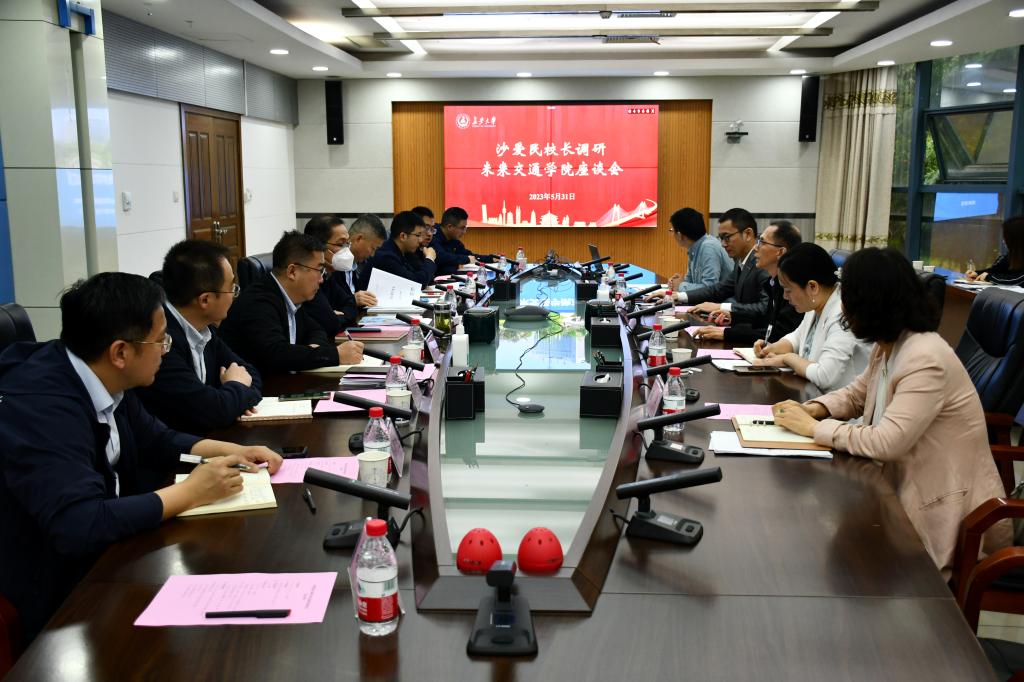 5月31日上午,校长沙爱民一行到未来交通学院调研新型特色学院建设与拔尖创新人才培养,与学院全体领导班子成员座谈交流。校长助理裴建中,校办、发展规划处、教务处、研究生院、科研院、人事处、人才办等单位负责人参加调研。调研座谈会由未来交通学院执行院长孙健主持。