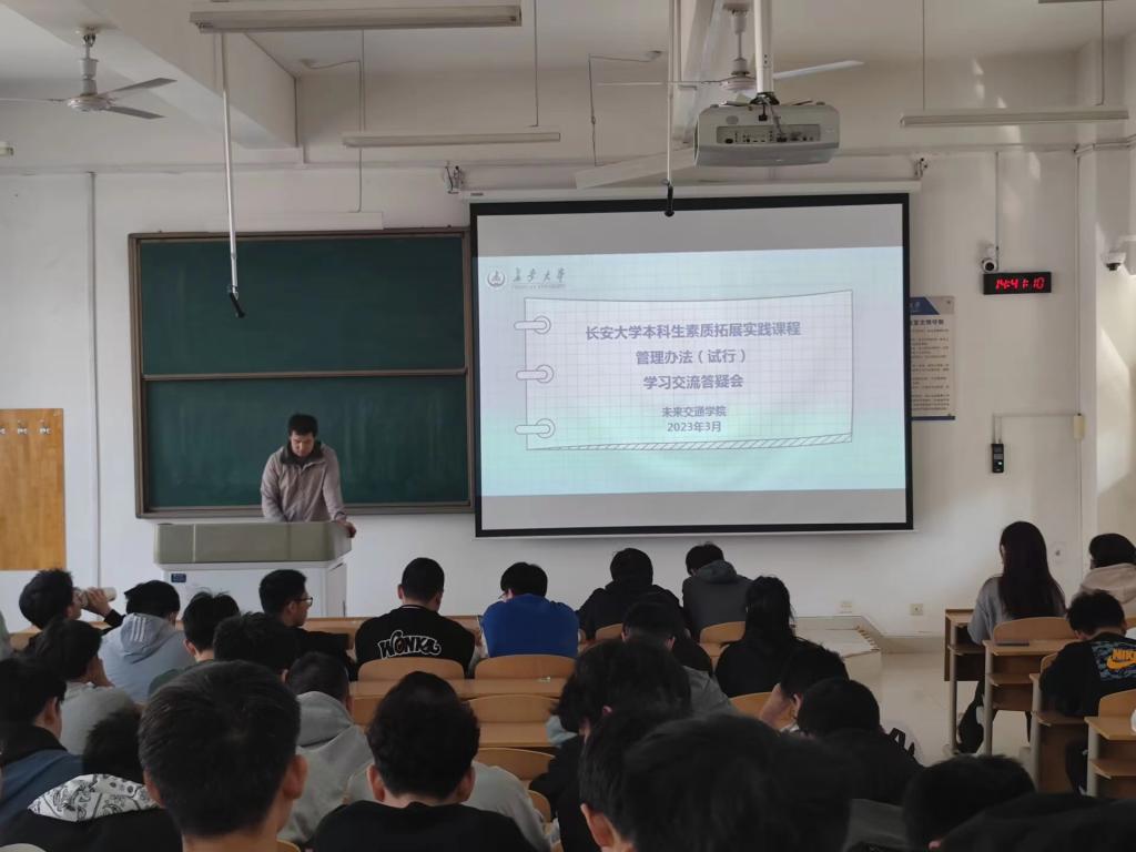 为贯彻落实立德树人根本任务,坚持发展素质教育,不断完善学生综合素质评价体系,强化共青团对青年学生群体的引领作用,2023年3月10日下午,未来交通学院组织开展2022级本科生素质拓展实践课程管理办法学习培训交流答疑会,院团委书记、2022级辅导员曾晓阳主讲,全体2022级本科生参会。