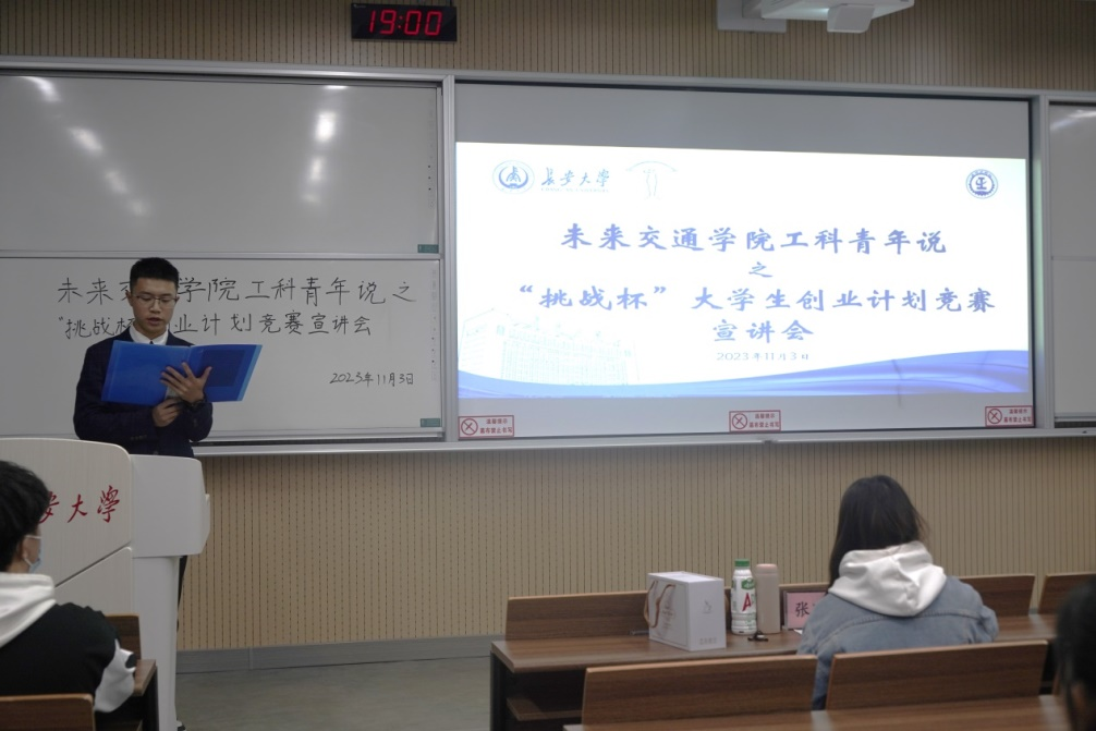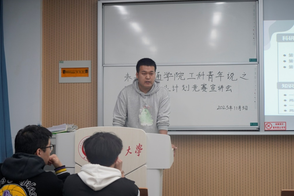 为顺利开展“挑战杯”大学生创业计划竞赛各项事宜,使同学们能更加全面深入了解赛事,培养和提升同学们的创新创业和实践能力,11月3日19:00,未来交通学院大学生科技创新创业协会于北校区WX2102教室举办工科青年说之“挑战杯”创业计划竞赛宣讲会。此次宣讲会邀请运输工程学院大学生科技创新创业协会主席张明珠、信息工程学院2022级研究生董世浩主讲,未来交通学院团委书记曾晓阳出席,活动由院科协志愿者杨可豪主持。