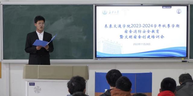 为进一步加强师生的消防安全意识,提高同学们安全防范和防火救灾的意识,同时指导开展创建文明宿舍活动,近日,未来交通学院于WH2102举办2023-2024学年秋季学期宿舍消防安全教育暨文明宿舍创建培训会,院学生会主席团成员赵何伟受邀担任主讲嘉宾,院团委书记曾晓阳出席活动,2022级、2023级全体宿舍长参会。会议由院学生会权益服务部志愿者张泰齐主持。