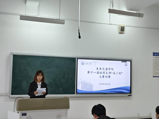 第十一届班团支部“五小创”大赛未来交通学院初赛在WH2203教室举办。地质工程与测绘学院科协主席郭宝营、能源与电气工程学院科协竞赛部负责人张畅担任评委。未来交通学院科协志愿者吴怡主持。