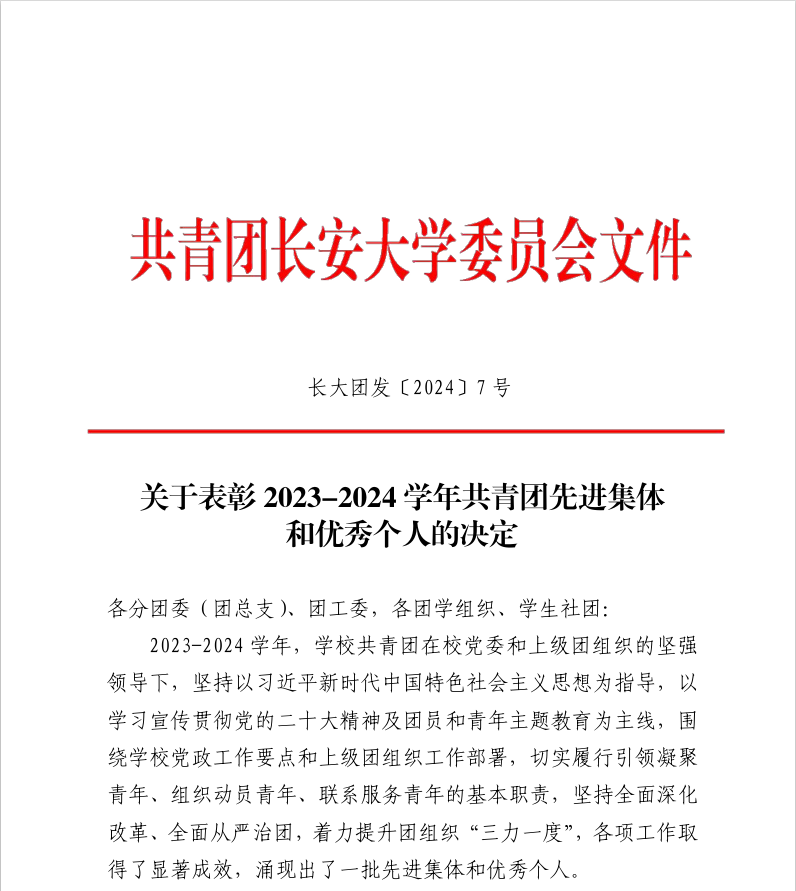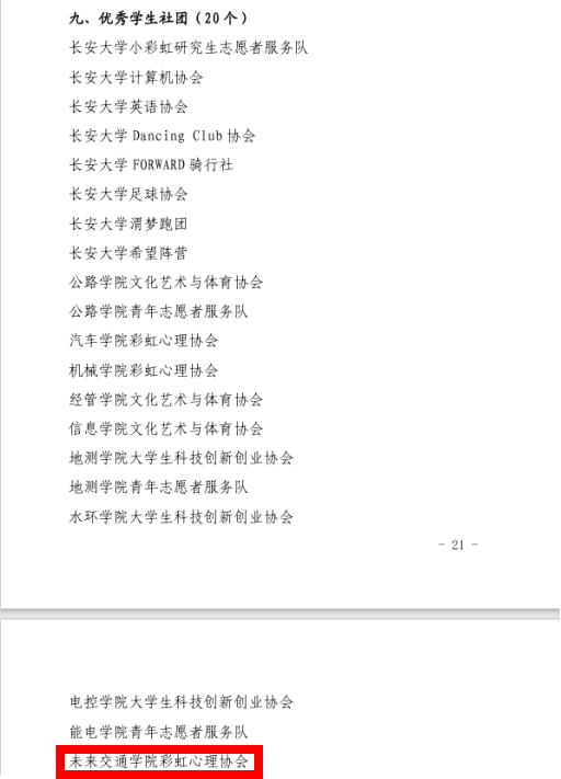 2023-2024学年共青团先进集体、优秀个人的通知》文件精神和工作要求,经过材料申报、考核评定等环节,未来交通学院彩虹心理协会荣获2023-2024学年“优秀学生社团”荣誉称号。