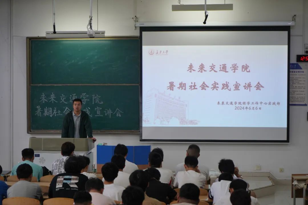 为深入学习贯彻习近平总书记关于青年工作的重要思想和关于教育的重要论述,引导当代大学生投身社会大课堂,争做有理想、敢担当、能吃苦、肯奋斗的新时代好青年,6月6日,未来交通学院组织开展2024年暑期社会实践活动宣讲培训会,往届暑期社会实践优秀学子朱梓豪、李佳霏、邵伯阳、张宇康受邀担任主讲嘉宾,院团委书记曾晓阳出席活动,2022级和2023级本科生参会,会议由院团学工作中心实践部志愿者钱思雨主持。