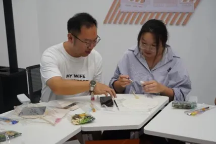 工作人员分发了烧箔团扇材料包,讲解了烧箔团扇的制作方法。在制作过程中,同学们先使用铅笔在团扇上设计图案,之后在设计好的图案上均匀地涂抹一层专用胶水,并将烧制好的金属箔按照图案的轮廓贴在扇面上,贴好箔片后,用工具轻轻扫去扇面上多余的箔料,最后在团扇上粘上美丽的干花,以增加团扇的美观度和个性化。活动中,同学们将对美的思考融入实践过程,制作出了一把把独一无二的烧箔团扇。