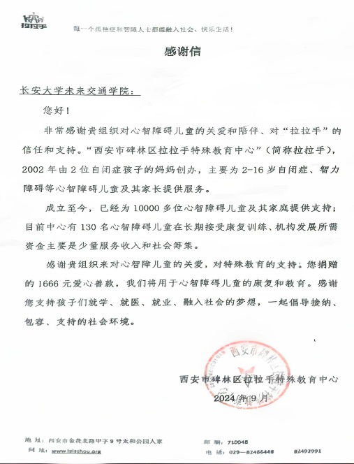 关爱和支持特殊儿童群体表达了由衷的感谢,并向学院回赠感谢信。