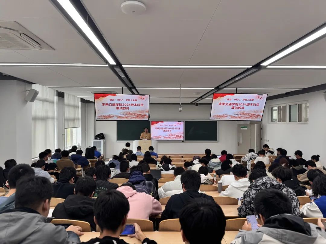 为深入贯彻党的二十届三中全会精神,学习习近平总书记关于廉洁文化建设的重要论述,培育学生敬廉崇洁的价值观念,11月19日下午,未来交通学院于北校区WH2208开展2024级本科新生入学适应教育(第10期)暨廉洁教育。学院2024级本科生辅导员刘志兴主讲,2024级全体本科生参加。