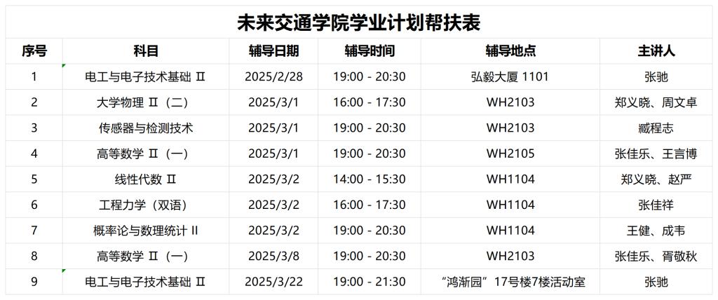 为进一步深化学院学风建设内涵,以精准化指导为抓手助力学生把握课程要点,以解决实际问题为导向破解学业困惑,着力营造崇学尚研的育人氛围,赋能学生成长成才,未来交通学院学生会组织开展2024-2025学年春季学期第一阶段学业辅导交流活动,共计14名志愿者参与辅导,实现补考学生参与覆盖率100%。