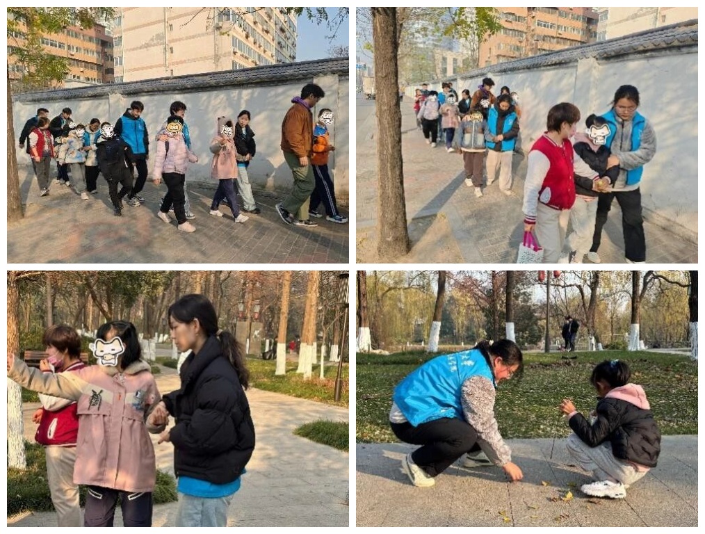 在特教中心老师指导下,志愿者与特殊儿童一一配对,前往兴庆宫公园进行户外活动,志愿者提前在公园内布置“宝藏卡片“,志愿者耐心引导孩子们自主寻找卡片,培养其独立性。志愿者与孩子们亲切互动,用实际行动表达了对孩子们的关心,孩子们也通过打招呼,温暖的拥抱等举动向志愿者回馈感激与爱意。