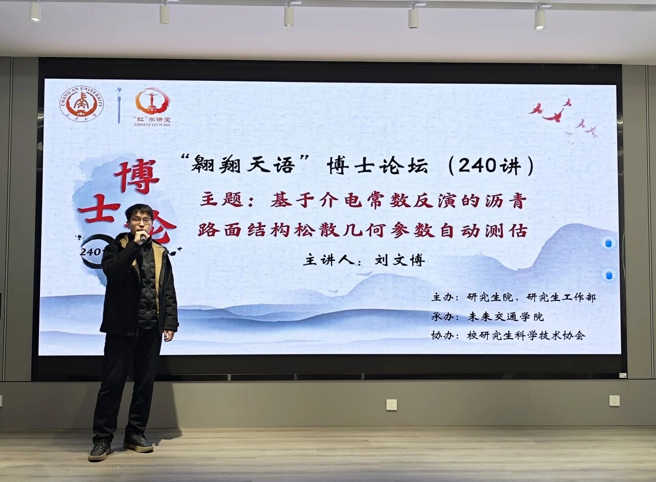 研究生科研素养,充分发挥先进典型示范引领作用,3月6日下午,由研究生院、研究生工作部主办,未来交通学院承办,校研究生科学技术协会协办的“翱翔天语”博士论坛第240讲暨“研途领航”系列论坛(第8讲)在北校区弘毅大厦11层未来大师堂顺利举办。公路学院博士研究生刘文博受邀并作了题为“基于介电常数反演的沥青路面结构松散几何参数自动测估”的报告,学院50余名研究生参与论坛。