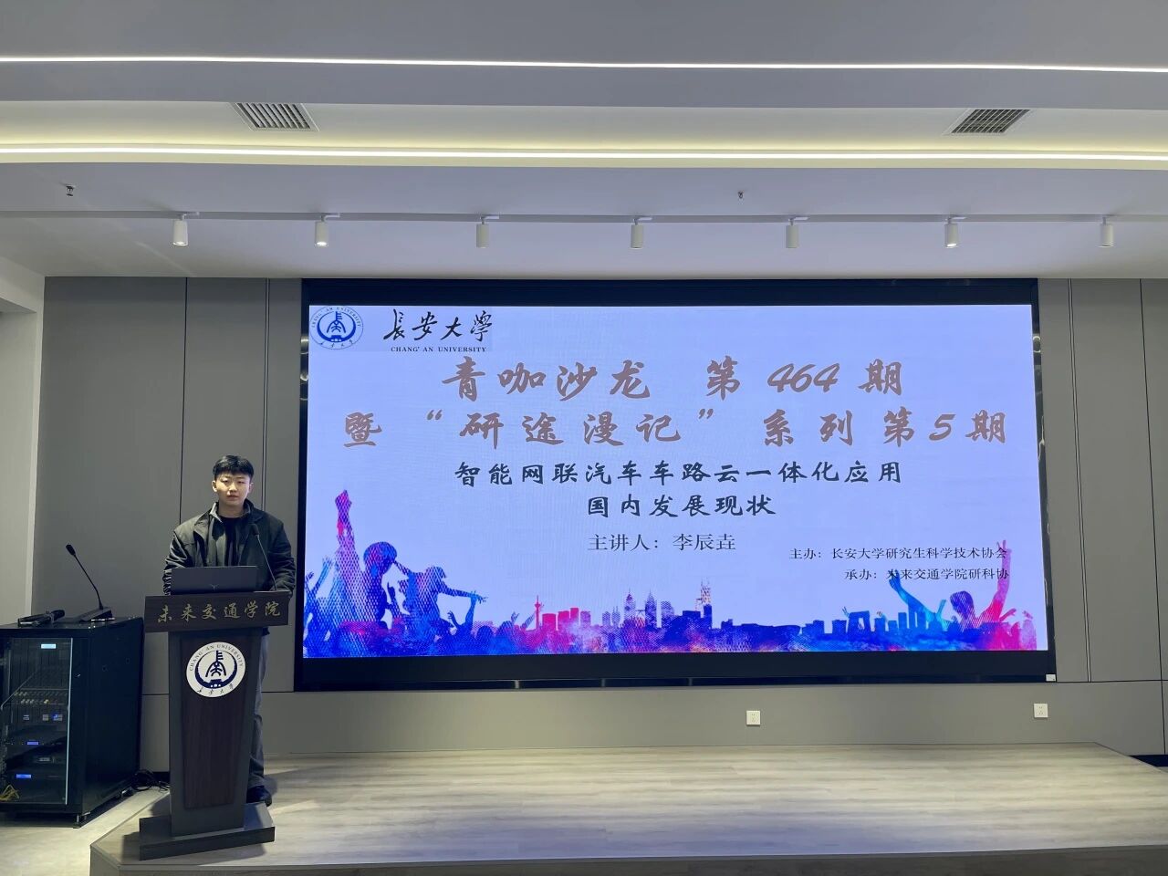 研究生科学技术协会主办、未来交通学院研科协承办的青咖沙龙第464期暨“研途领航”系列论坛(第9讲)在北校区弘毅大厦11层未来大师堂举办。未来交通学院交通运输工程专业2024级硕士研究生李辰垚受邀作题为《智能网联汽车车路云一体化应用国内发展现状》的报告,来自未来交通学院、信息学院80余名研究生参加。