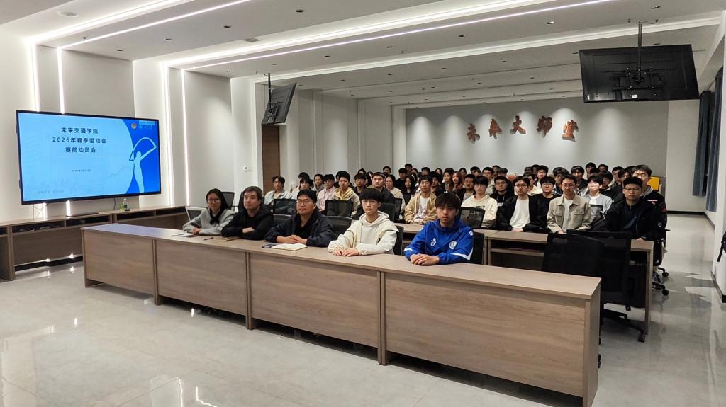 为扎实做好2026年春季校运会筹备工作,进一步激发全院学子参与体育运动的热情,3月31日晚,未来交通学院于弘毅大厦未来大师堂召开2026年春季运动会赛前动员会。院团委书记曾晓阳、院文体协会指导老师范荣欣出席会议,院团学组织和学生社团主席团成员、各训练项目负责人参会。会议由院文体协会主席路明柯主持。