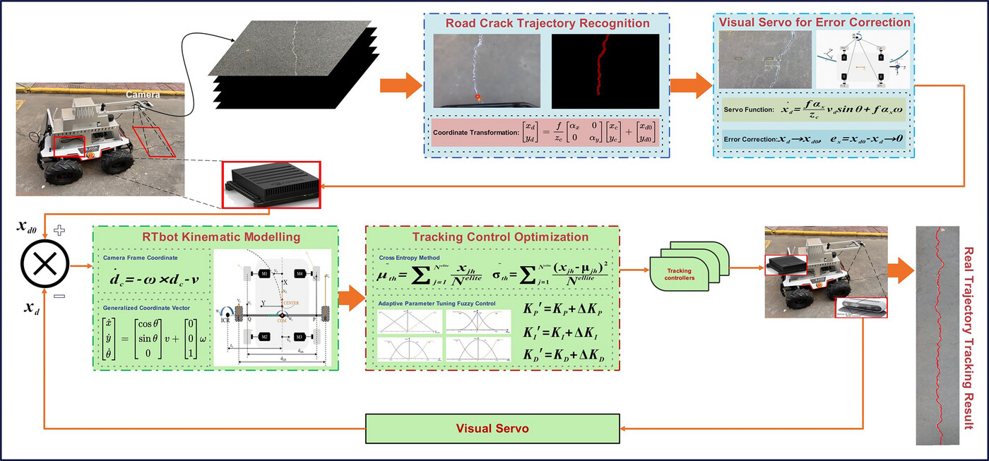 路面裂缝的实时寻迹跟踪是当前路面裂缝自动化修复方向上的研究前沿,但是由于路面环境及裂缝状态复杂,路面裂缝的识别、控制精度和鲁棒性受到挑战。为了解决上述技术难点,该研究提出了一种基于交叉熵的自适应模糊控制(CEAFC)方法,实现了无人移动机器人(VT-UMbot)对道路裂缝的视觉跟踪。具体来说,CEAFC方法使用交叉熵优化迭代来调整跟踪控制器的参数,并构建模糊逻辑来探索鲁棒性的提高。此外,建立了基于四轮独立差速驱动的VT-UMbot机器人框架,并将视觉伺服和跟踪控制集成到系统中。我们的实验表明,所提出的方法在三种道路裂缝场景中进行了广泛的评估,并以高效率实现了最先进的路面裂缝实时跟踪性能。