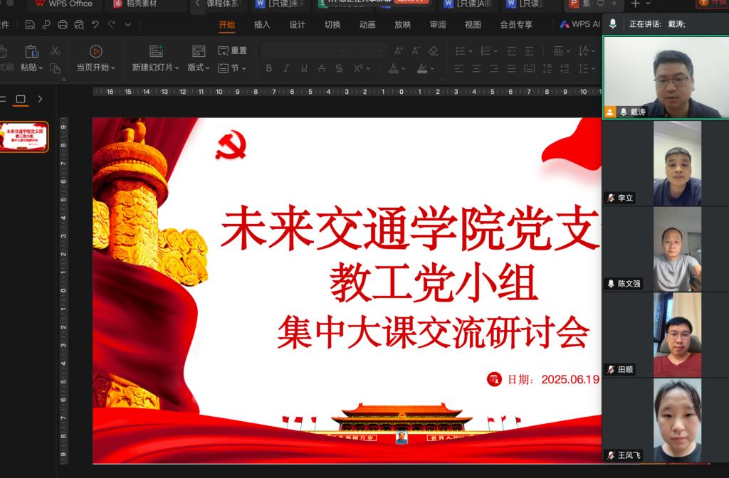 6月16日,未来交通党支部全体党员参加了学校组织的党员基本培训第一次集中大课,认真学习了教育部党组书记、部长怀进鹏所作的专题辅导报告。为进一步巩固学习成效、推动思想入脑入心,未来交通党支部高度重视、精心组织,结合实际工作特点,按照专任教师、行政管理、研究生、本科生四个党小组,于6月19日和6月23日分别组织开展了以“立足岗位勇担当,共筑教育强国未来”为主题的交流研讨活动。四个党小组全体党员积极参与,实现了人员全覆盖、思想全动员,营造了浓厚的学习交流氛围。