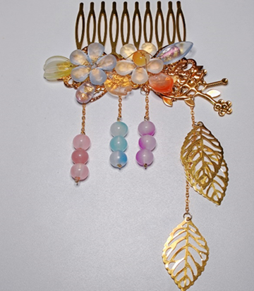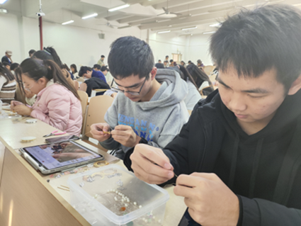 自由制作环节,无论是个人还是好友组队,大家都全身心投入到学习制作中,每位同学都将自己的奇思妙想转化为创意实践呈现在小巧的发簪上。有作品以“玲珑”为名,一颗颗珍珠有条不紊地连成一串,代表心灵的清澈明亮;有作品以“星河花语”为主题,一朵朵花纷纷绽放在簪头,在夜晚的灯光映衬下恍如星河,长悬夜空;有作品借鉴“蝶恋花”的故事,用蝴蝶般的发簪展现学生美好的青春,更显活泼和灵动,丰富多样的作品形式充分展现了长大学子的审美艺术与手工创造力。此外,活动期间,院团委书记曾晓阳也加入其中,与同学们一起制作发簪,共同感受中华传统文化的艺术和魅力。
