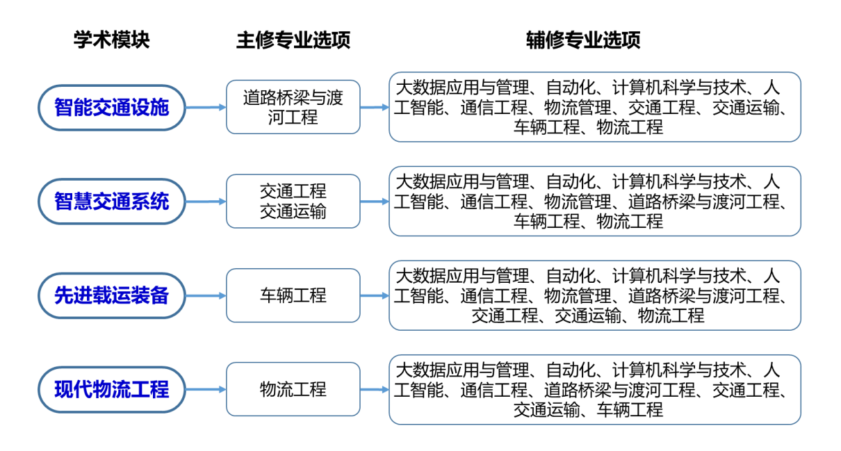 未来交通学院本科生按照工科试验班大类招生,并根据成人网 优势专业和交通运输工程学科未来发展趋势设置四大学术模块,包括智能交通设施、智慧交通系统、先进载运装备、现代物流工程。每一学术模块下,设置一到两个主修专业和多个可选辅修专业。专业分流时学生可根据兴趣和志愿选择一个主修专业和一个辅修专业,毕业证书和学位证书上同时标注主修专业和辅修专业。